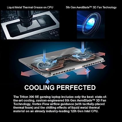 • Cooling Perfected: The Triton 300 SE gaming laptop includes only the best: state-of-the-art cooling, custom-engineered 5th Gen AeroBlade 3D Fan Technology, Vortex Flow airflow guidance (with tactfully placed thermal foam) and the chilling effects of liquid metal thermal material on an already industry-leading 12th Gen Intel CPU.