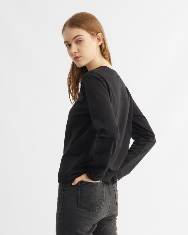 Obsessed with every detail. Minimalistic, essential, and thoughtful designs are redefined in gender-inclusive silhouettes. This long-sleeve T-shirt is cut in a boxy fit that stretches out from the waist. Signature with minimal branding decal.