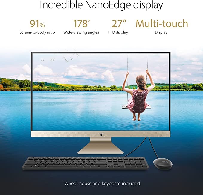 ASUS AiO 27” All-in-One Desktop Computer, AMD Ryan 7 5700U, 27” LED-Backlit Touchscreen Display with NanoEdge Bezel, 16GB DDR4 RAM, 512GB PCIe SSD, Wired Keyboard and Mouse, Black, Windows 11 Home