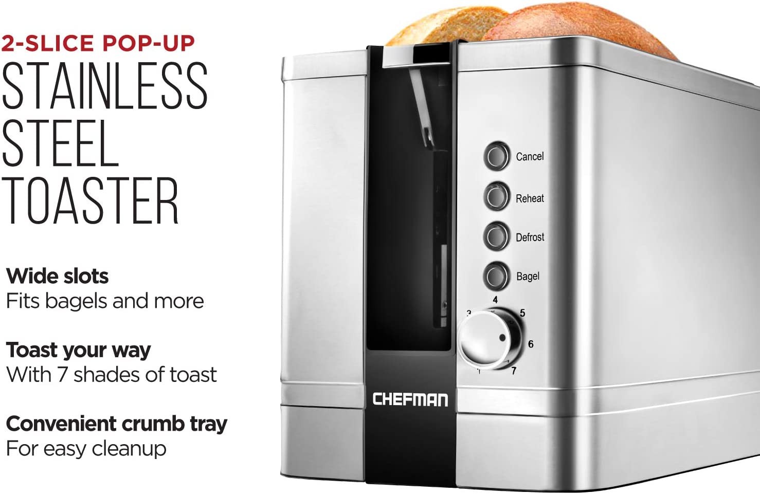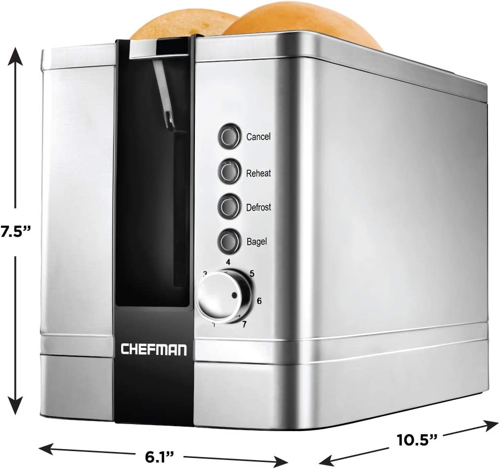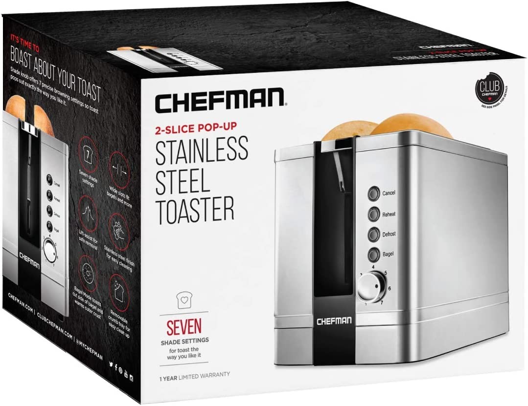 UPGRADE YOUR TOASTER: The Chefman 2 Slice Pop-Up Toaster has a modern look with a classic brushed stainless-steel exterior giving your countertops a timeless upgrade. The 7 different shade settings plus bagel, reheat, and defrost functions offer customizable options for just about any toasting need