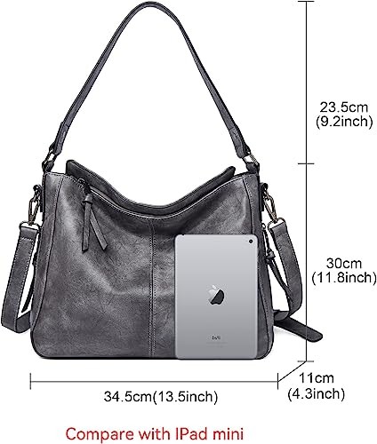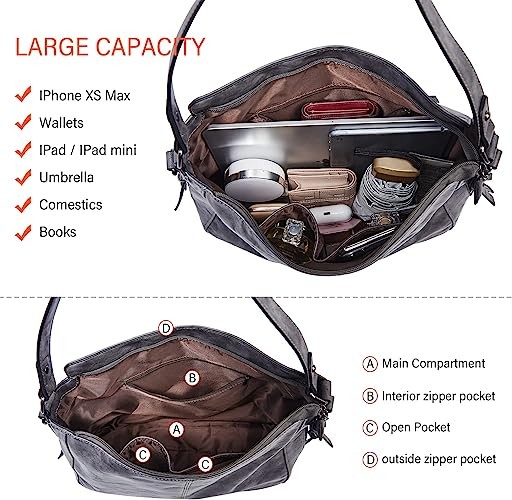 [Hobo Wallet Structure] - Top zipper closure, the bag has 1 inner zipper pocket and 2 open pockets. With 2 zipper pockets on the side and 1 zipper pocket on the back, multiple pockets can meet your needs for daily activities. The spacious interior can hold your smartphone, iPad, 13.3" MacBook, wallet, folding umbrella, perfume, lipstick, cosmetics, keys, important bills and more. Ideal as an everyday leather shopping bag.