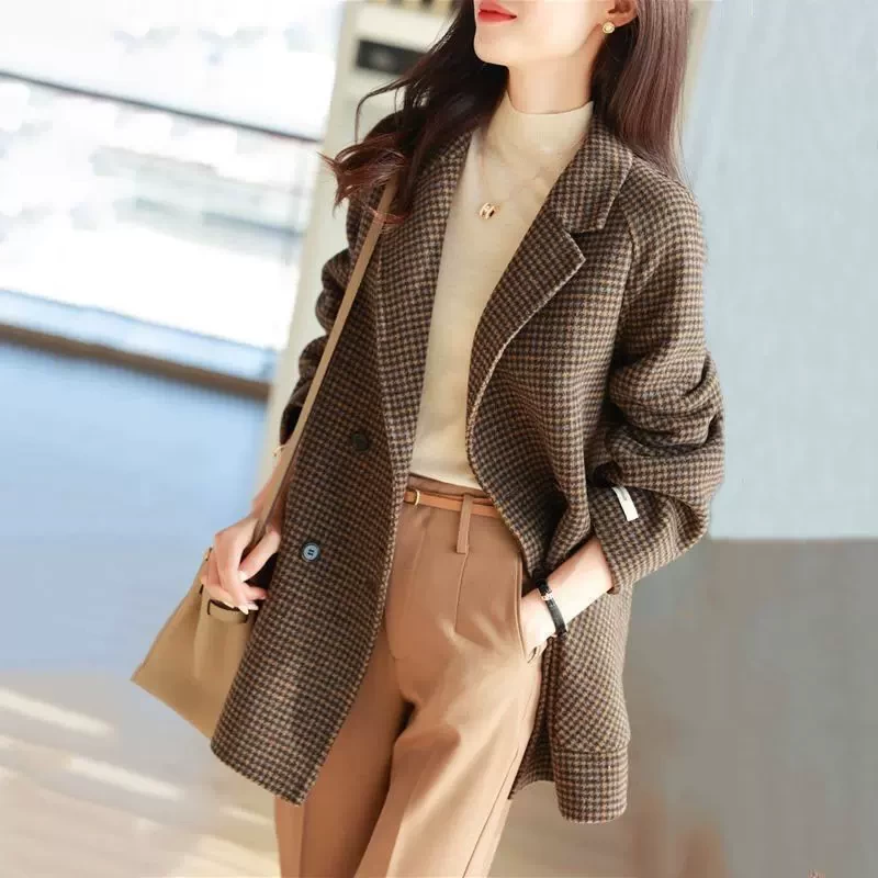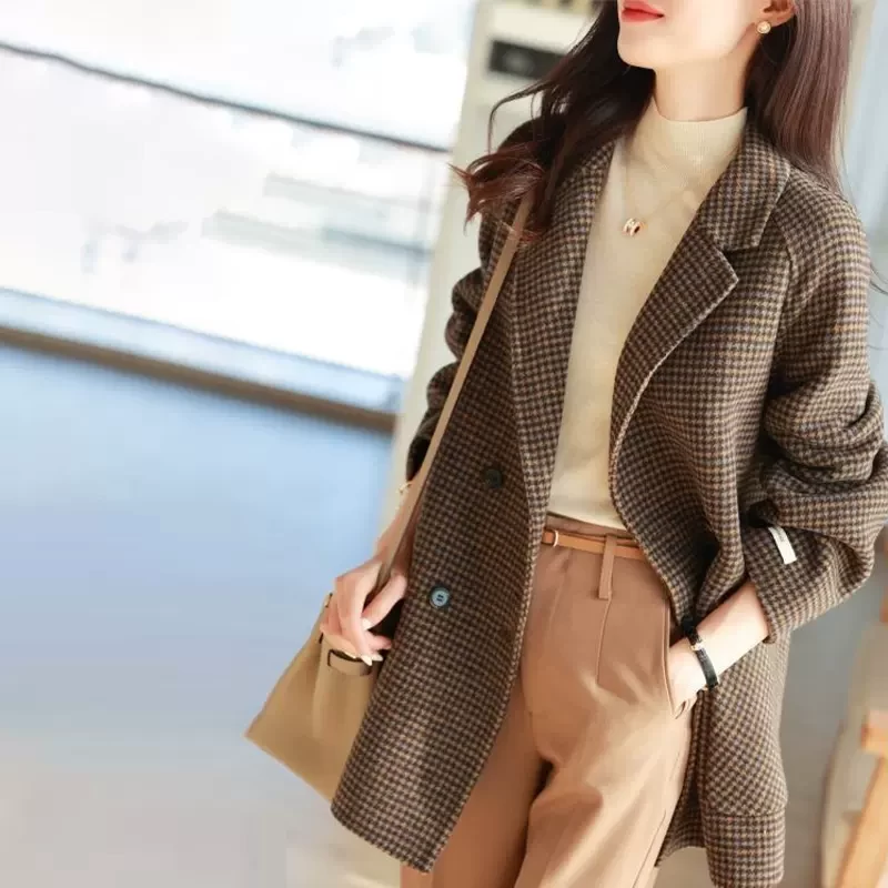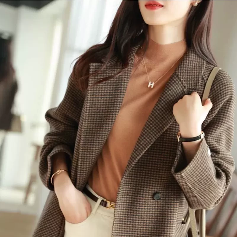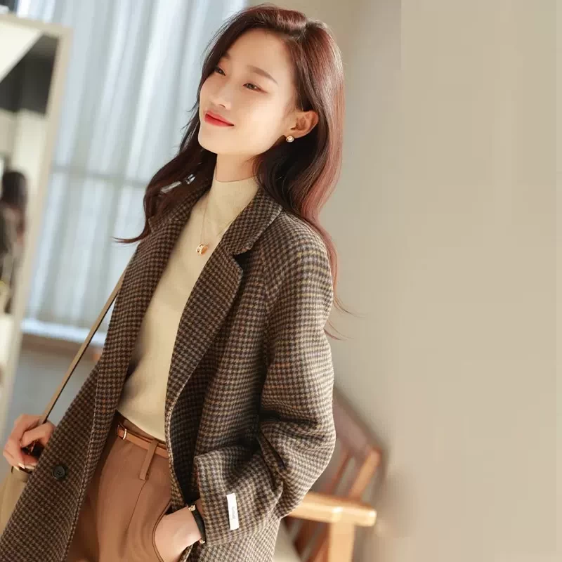 Houndstooth suit jacket women's high-end autumn and winter small fragrance mid-length thick woolen coat