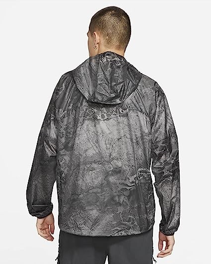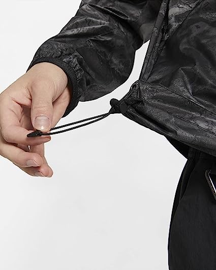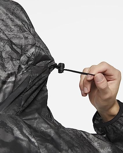 • Size Medium. Woven fabric provides lightweight coverage for warm-weather months. The jacket is water-repellent and windproof, helping you continue on your journey in less than ideal conditions. Convenient Coverage Hooded coverage helps keep the elements out. A bungee at the back neck lets you adjust your fit. When you need to layer down, the jacket can be packed into itself for easy carrying. Secure Storage Zippered hand pockets help keep your small items stored.