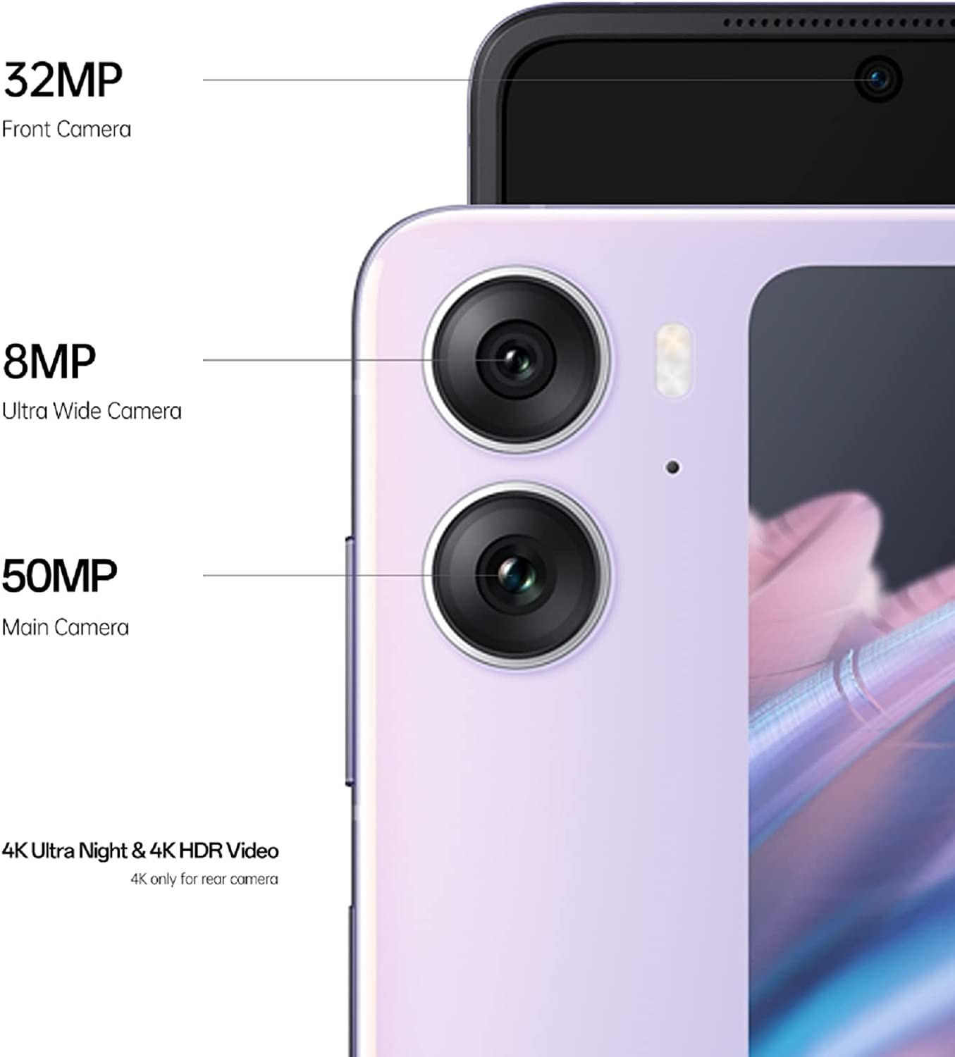 • 50 MP, f/1.8, 23mm (wide), 1/1.56", 1.0µm, multi-directional PDAF, 8 MP, f/2.2, 112˚, (ultrawide), Front, 32 MP, f/2.4, 22mm (wide), 1/2.74", 0.8µm, AF