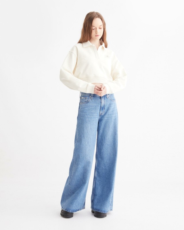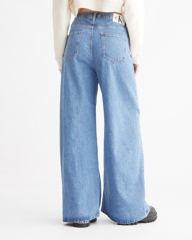 The iconic loose fit is reimagined in sustainable denim that uses less water and energy than traditional denim. This denim silhouette features a low rise and wide legs. Embossed cK Monogram badge on back.