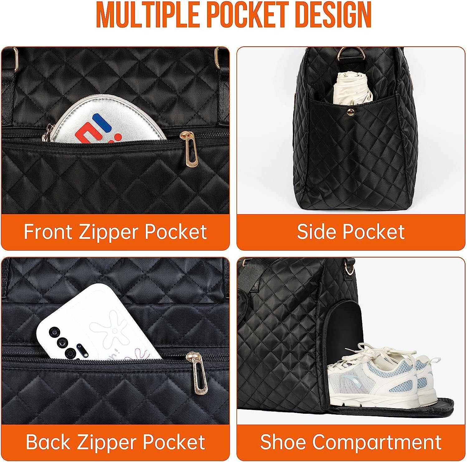 【Multiple Compartment Design】This women's weekender bag is designed with thoughtful multi-compartment. The interior of the bag has 1 large main compartment, 1 zippered separate waterproof pocket and 4 slip pockets. There is 1 side zippered shoe compartment, 1 zippered front pocket, 1 back zippered pocket and 1 side slip pocket.