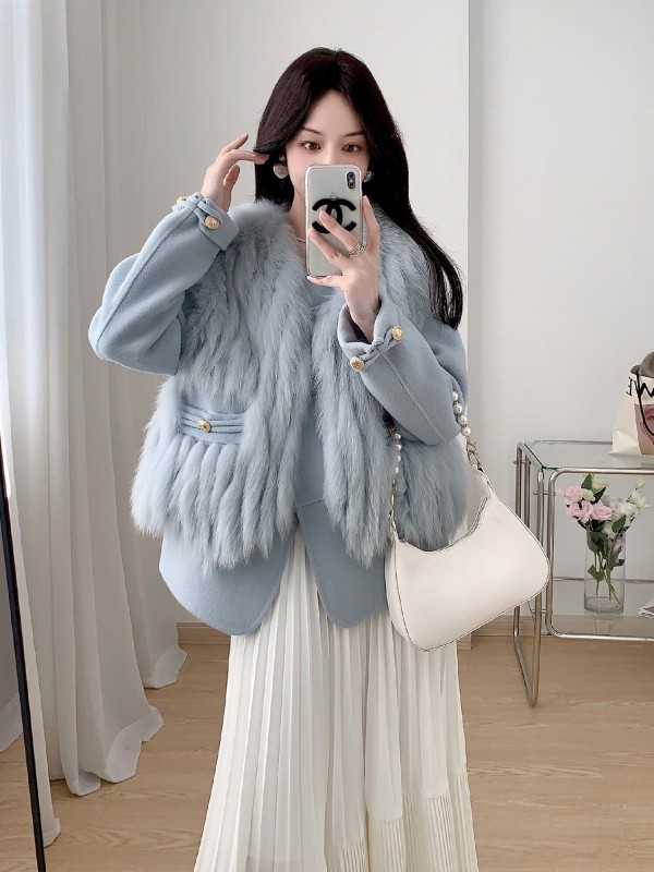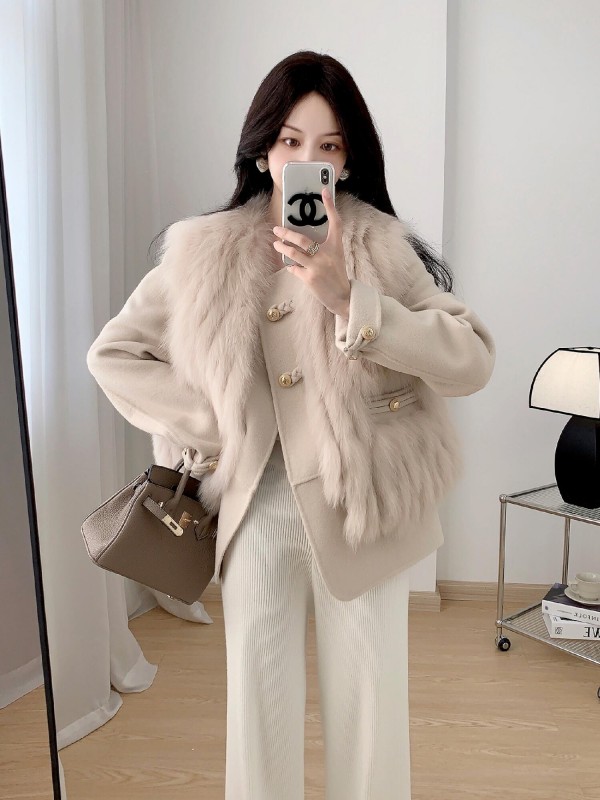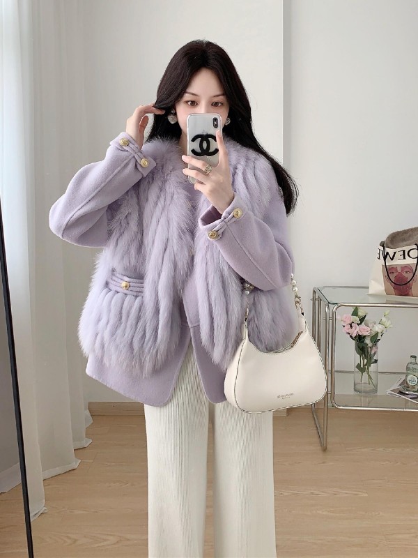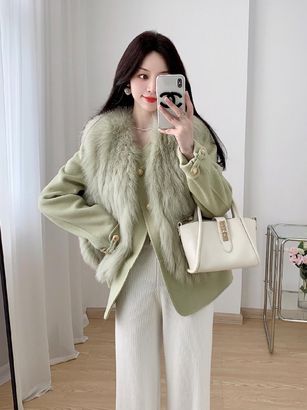 Winter new car strip fox fur vest coat female young style cashmere woolen color: green beige purple gray gray milk tea